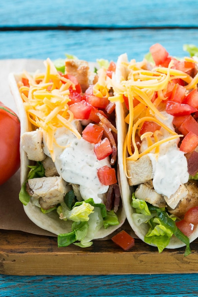 THIS RECIPE FOR CHICKEN RANCH TACOS IS GRILLED CHICKEN WITH BACON, HOMEMADE RANCH SAUCE, CHEESE AND FRESH VEGETABLES, ALL STUFFED INSIDE WARM FLOUR TORTILLAS. A FAMILY FRIENDLY MEAL THAT’S SIMPLE TO MAKE AND FUN TO EAT!